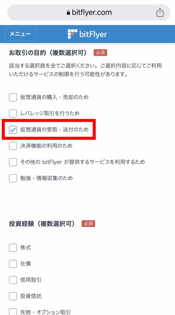 - 【仮想通貨の受取・送付のため】を選択します。