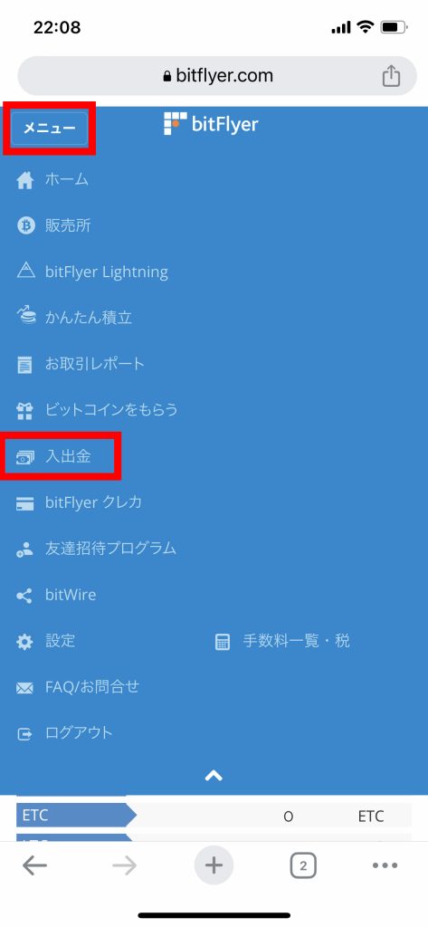 - bitFlyerの【メニュー】から、【入出金】を選択します。