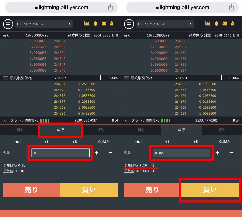 - ちょうどいい値になったら、下の大きな【買い】ボタンを押します。