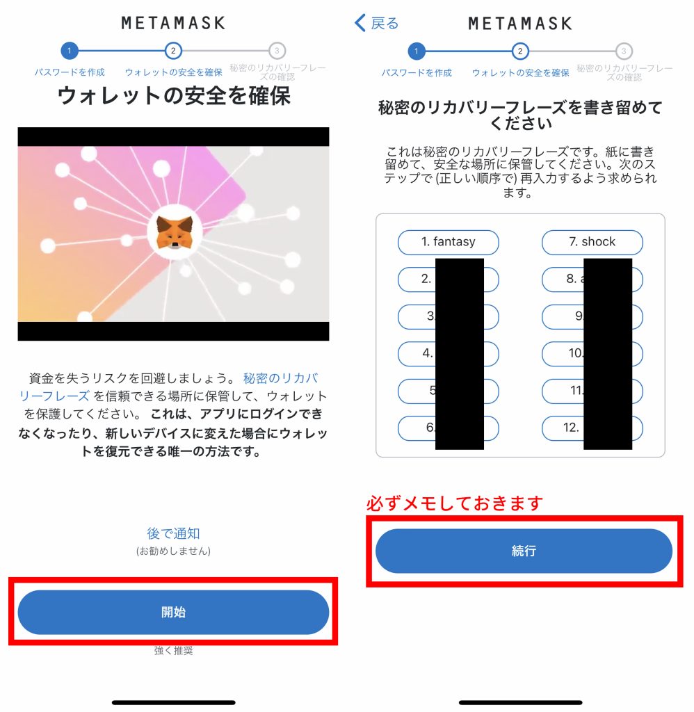 - 【開始】を選択しパスワードを入力して、リカバリーフレーズの設定をします。