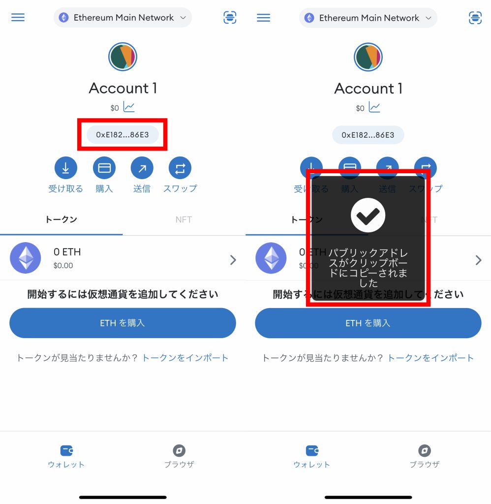 - パブリックアドレスがコピーされましたと出れば成功です。