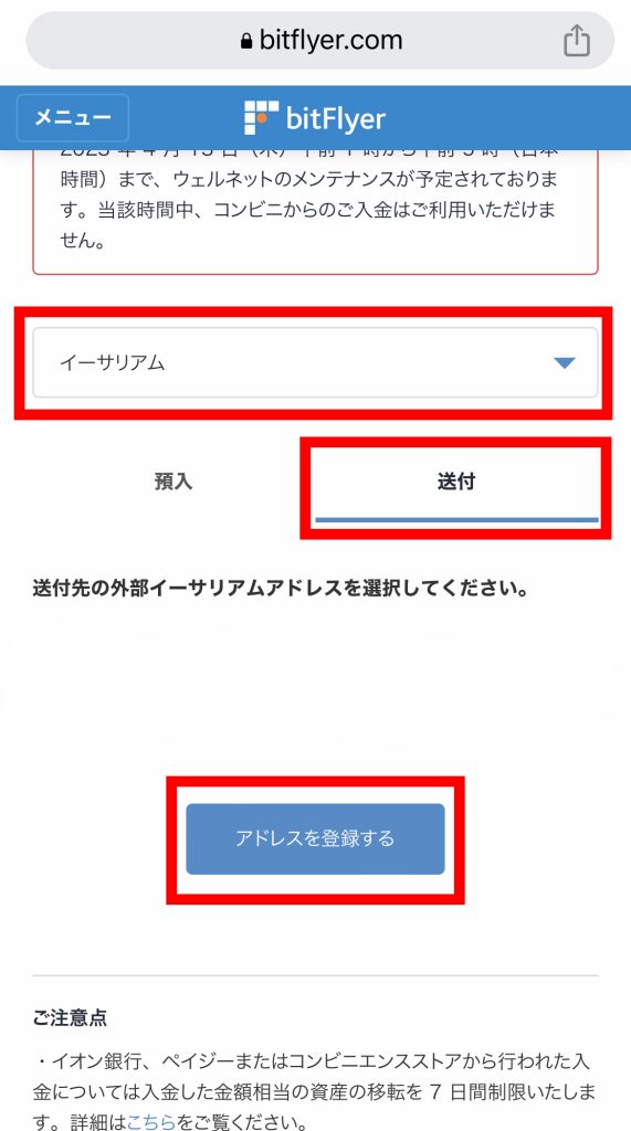 - 【メニュー】→【入出金】から、【イーサリアム】を選択します。