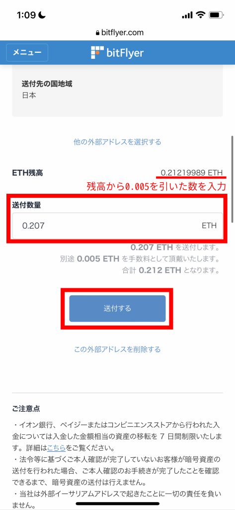 - 【送付数量】欄に、【ETH残高 – 0.05】の値を入力します。
